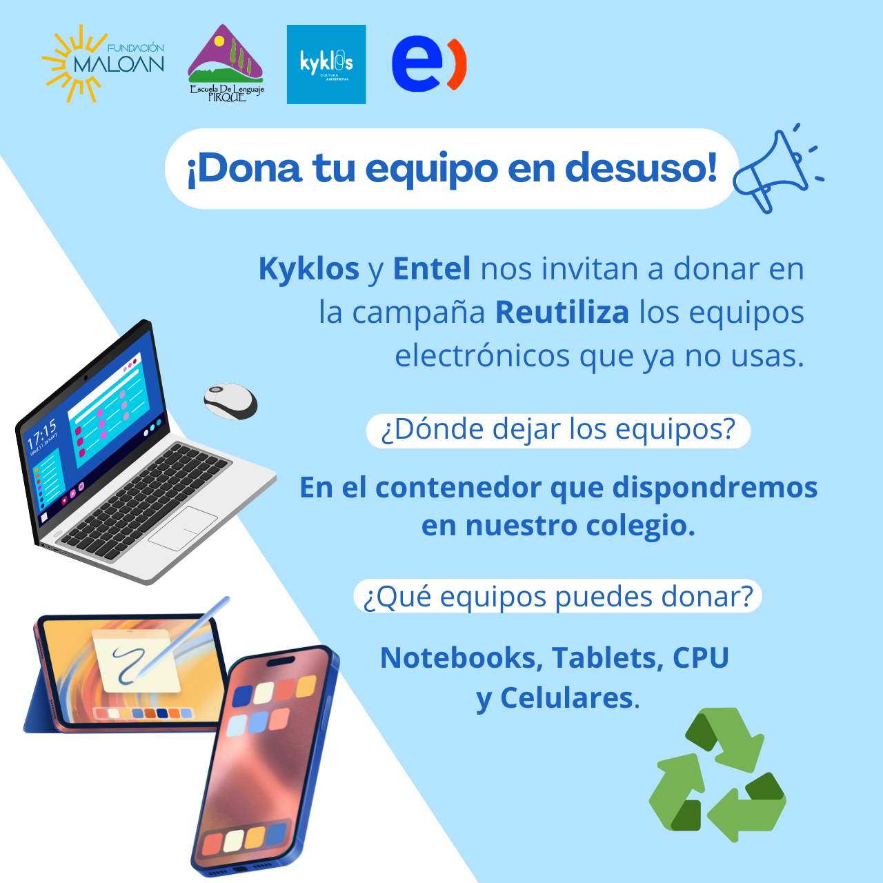 ¡Dona tecnología, regala oportunidades! 💚♻️ En la Escuela de Lenguaje Pirque nos sumamos a la campaña junto a Kyklos y Entel para dar nueva vida a esos equipos electrónicos que ya no usas 🙌✨ 🖥️📱 ¿Tienes en casa un notebook, tablet, CPU o celular en desuso? ¡Este es el momento de darle un mejor destino! […]