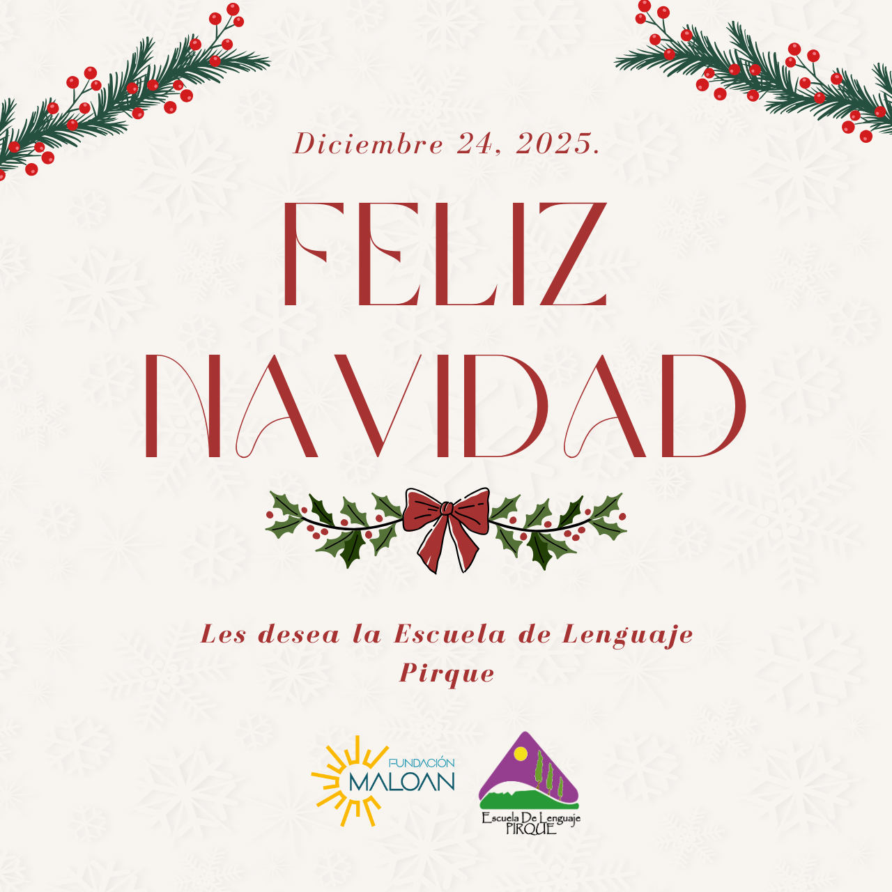 Querida Familia:Deseamos para todos y todas que esta noche buena, traiga a sus corazones alegría.Que la luz de un nuevo día colme vuestras almas de felicidad para que la magia de la Navidad llene cada rincón de tu hogar con armonía y paz.¡FELIZ NAVIDAD!Escuela de Lenguaje «Pirque»